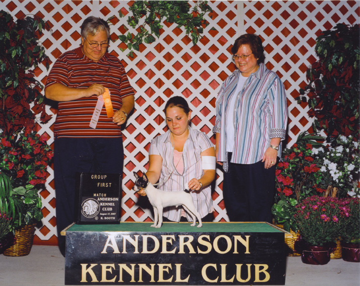 Chanel is registered with the American Kennel Club (AKC) and the United Kennel Club (UKC). She is an AKC Champion and she is owned by Mandy's mom Theresa Price. She is 10 inches tall and weighs 6.5 lbs. Chanel was specialed lightly in 2006 by Mandy and finished the #8 TFT for the year in AKC Breed Points!! She is now retiring from the show ring to become a mommy and is doing a great job at that!!!... From her first litter in Apr 2007 she had 4 pups, all of which were shown and all are champions!! Chanel has been tested clear for CHG. Chanel's next litter is planned for spring/summer 2009.